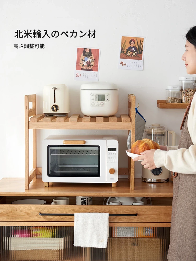 天然木材使用の実木製キッチン用電子レンジラック - 家庭にぴったりな収納スペースを提供!クルミ材の多機能オーブンラックで、スタイリッシュに整理整頓!