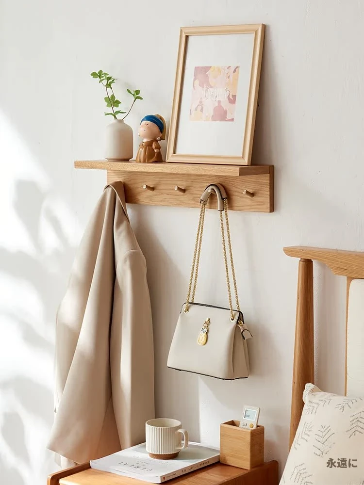 天然木製壁掛けフック収納ラック - エントランスや寝室に最適なコートハンガー、バッグ置き場としても使用可能!シンプルでスタイリッシュなデザインで、あなたの空間を美しく彩ります。