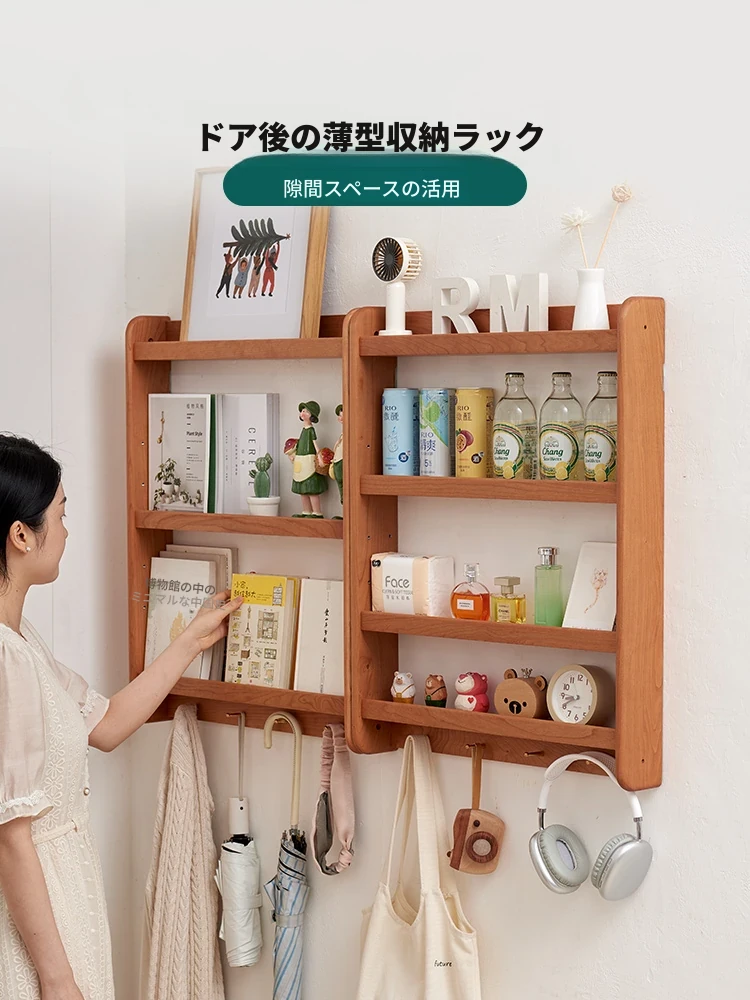 ドア後にぴったり!薄型収納ラック - 壁掛け式本棚、実木製のチェリーウッドで作られた子供用絵本収納、寝室や狭いスペースにも最適です!お部屋をスッキリ整頓して、子供の本をおしゃれに収納しましょう!