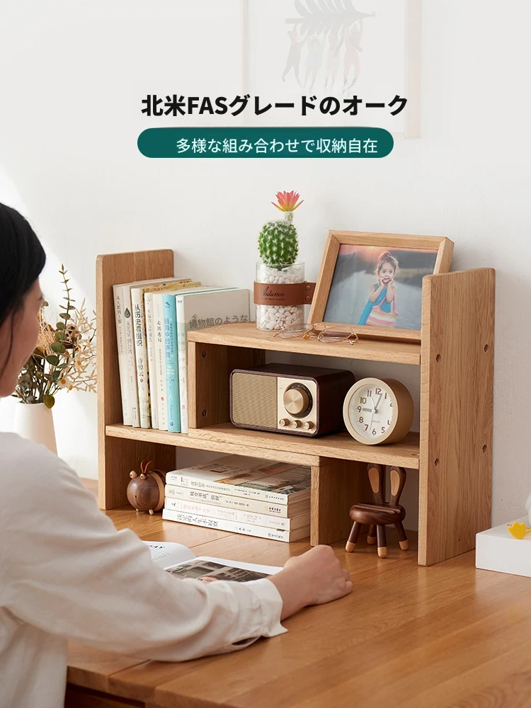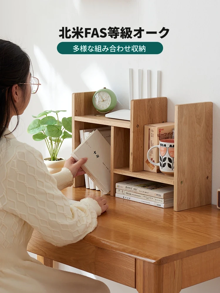 北欧スタイルの伸縮可能な実木デスクトップ書棚 - 学習・オフィスに最適なコンパクト収納ラック、オーク材使用で高級感と耐久性抜群!