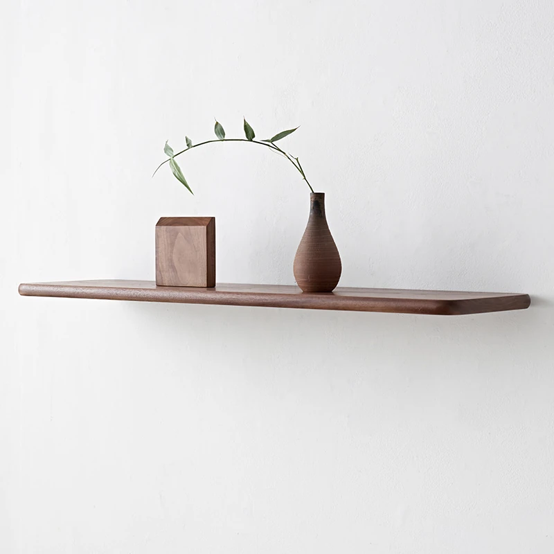 黒胡桃の無垢材を使用した壁掛けシェルフ - リビングルームに最適な収納ソリューション!美しいデザインでテレビ壁面をスタイリッシュに演出し、あなたの空間をグレードアップ。シンプルで機能的な一文字棚で、すっきりとした印象を与えます。