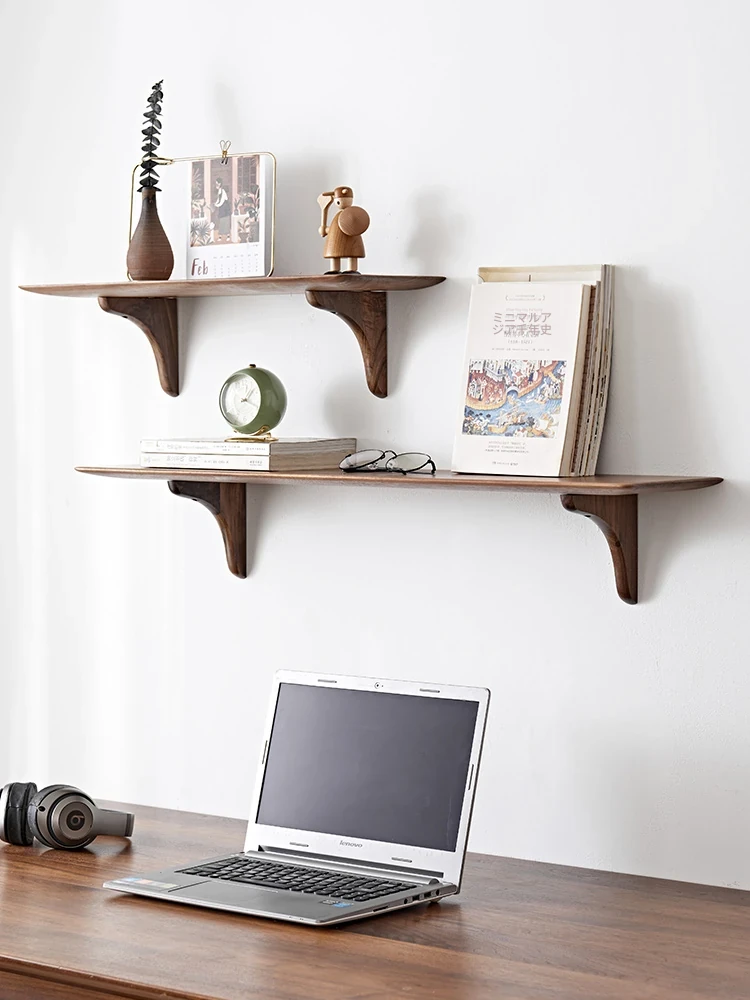 北欧風実木壁掛けシェルフ - 壁面用のスタイリッシュな一字型棚、テレビアクセントに最適な黒胡桃木製の飾り棚。リビングルームをおしゃれに演出!