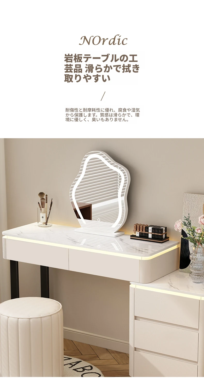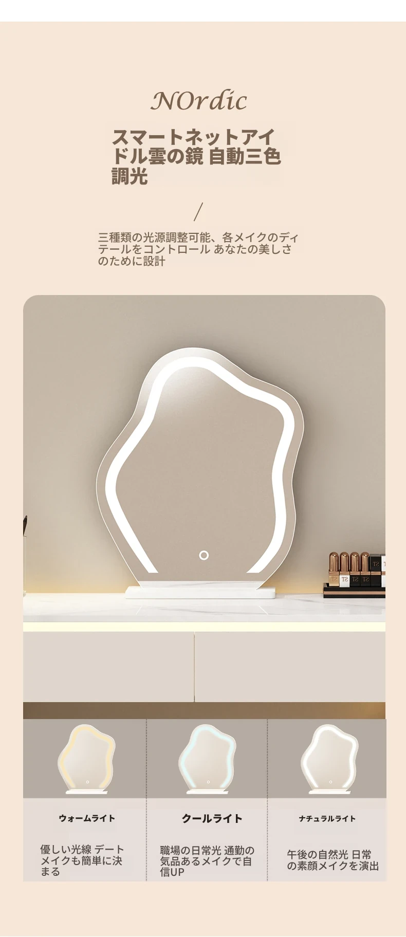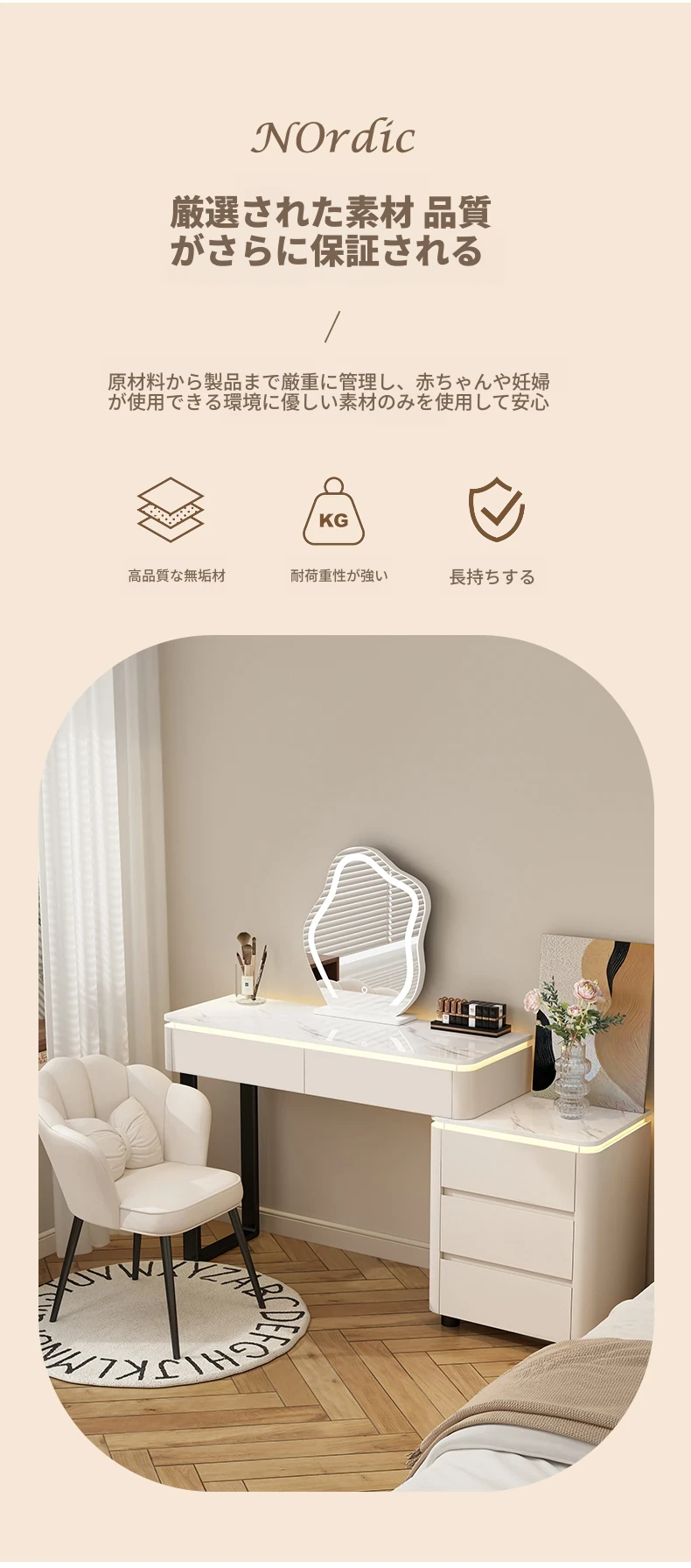 80ホワイトテーブル+3段引き出しキャビネットホワイト+雲の鏡:椅子なし JX-ムードライトタイプ