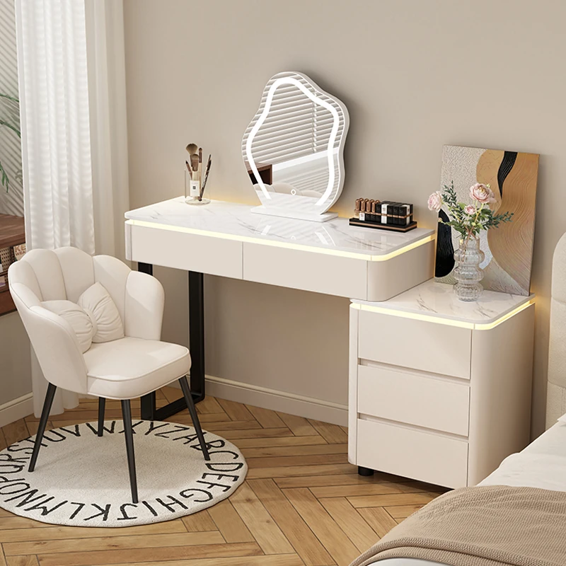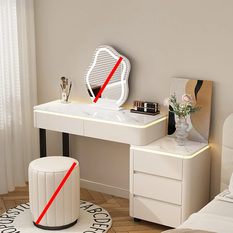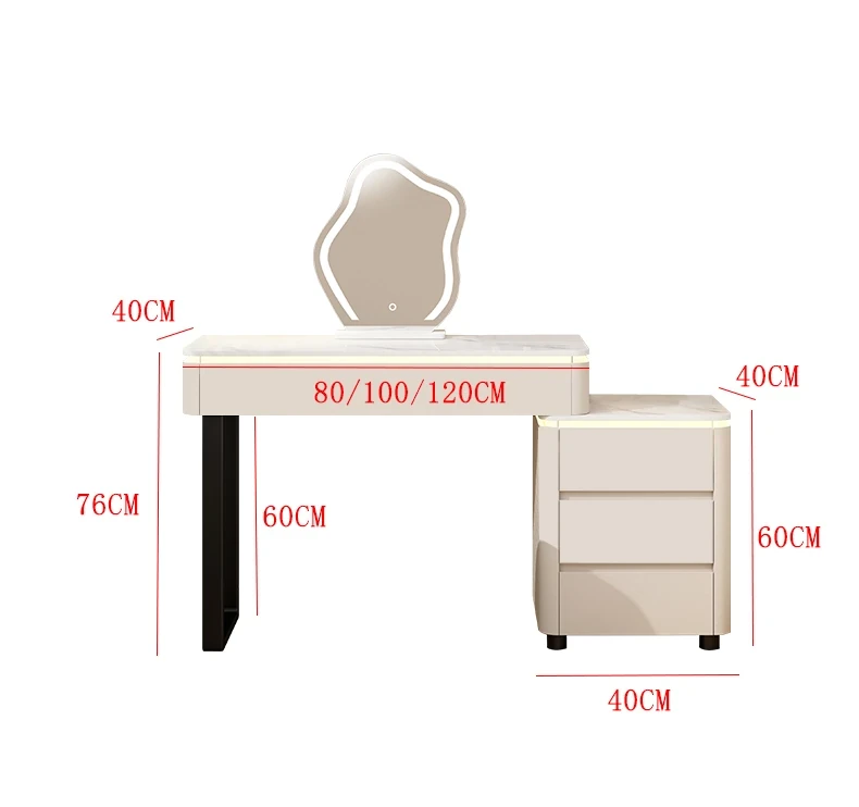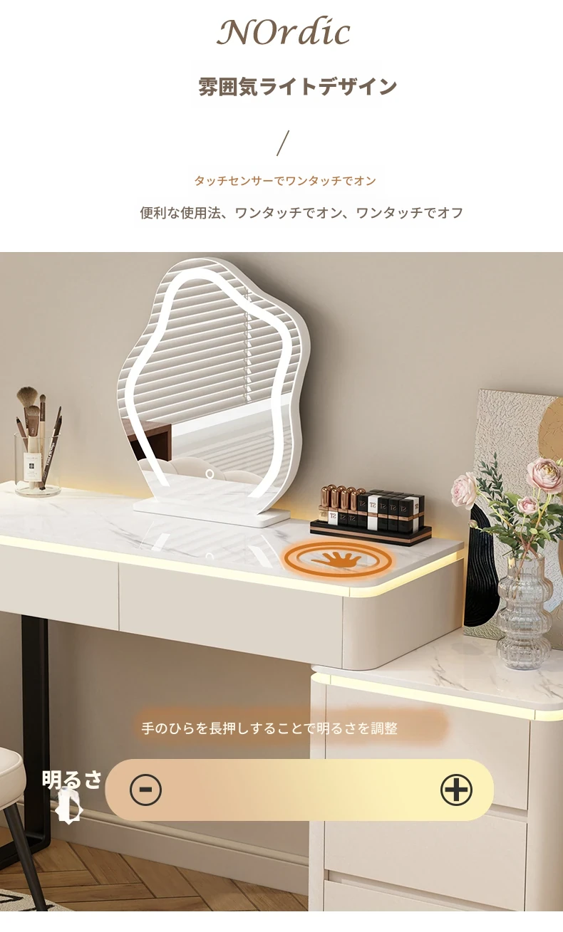 80ホワイトテーブル+3段引き出しキャビネットホワイト+雲の鏡:椅子なし JX-ムードライトタイプ