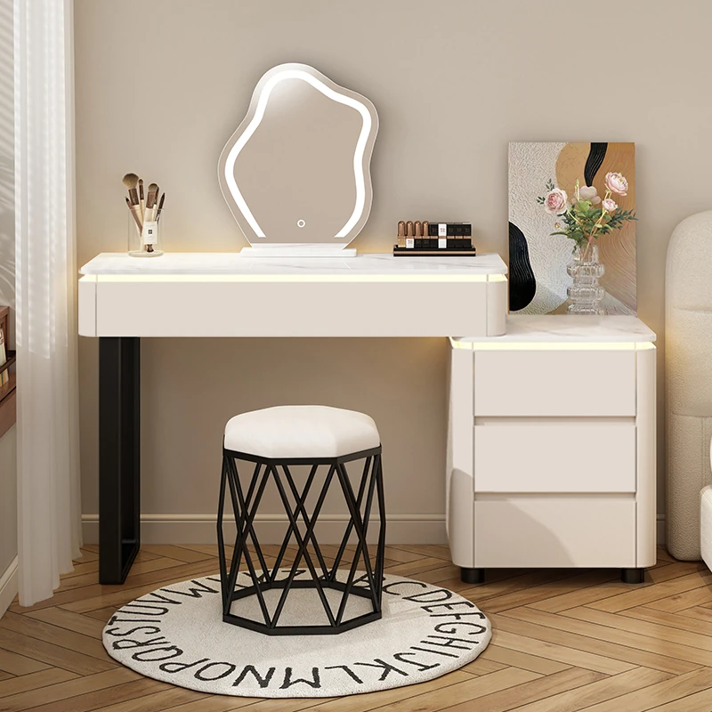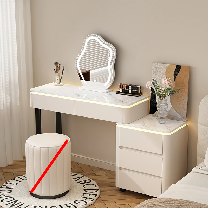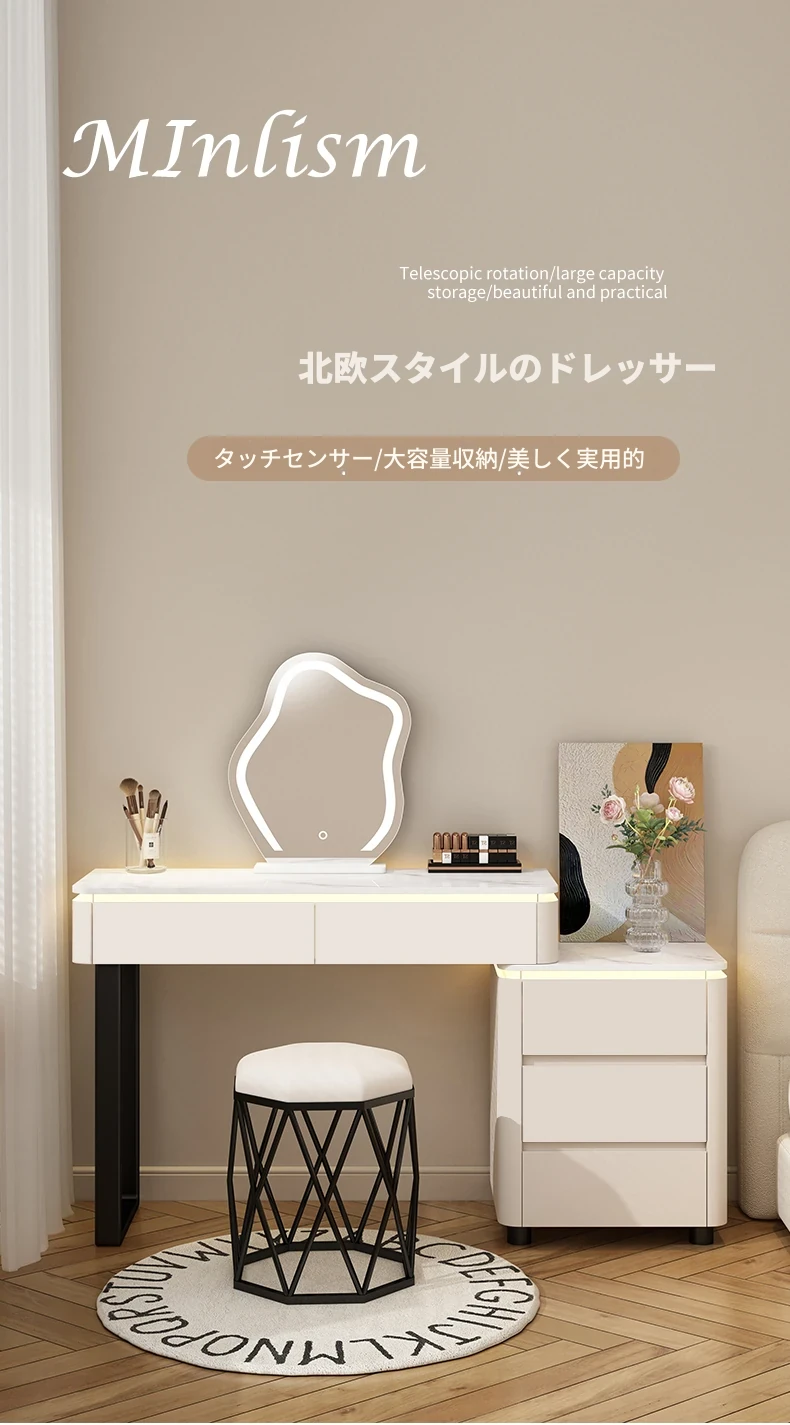 100ホワイトテーブル+3段引き出しキャビネットホワイト+雲の鏡+丸椅子ホワイトブラック JX-ムードライトタイプ