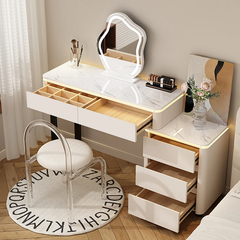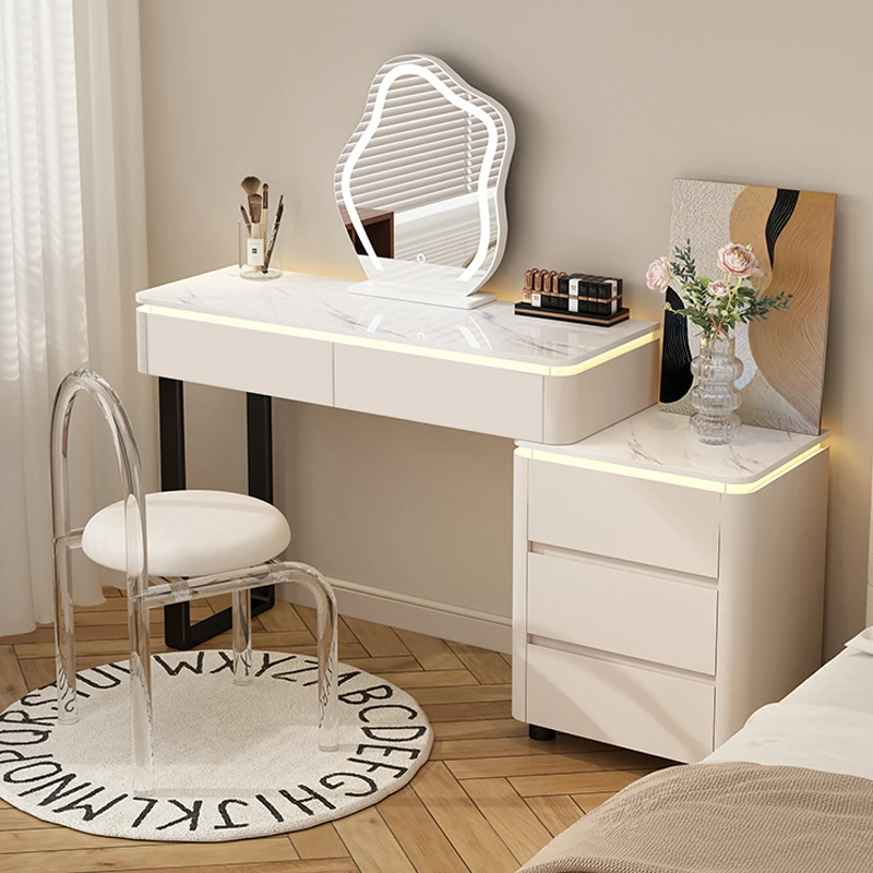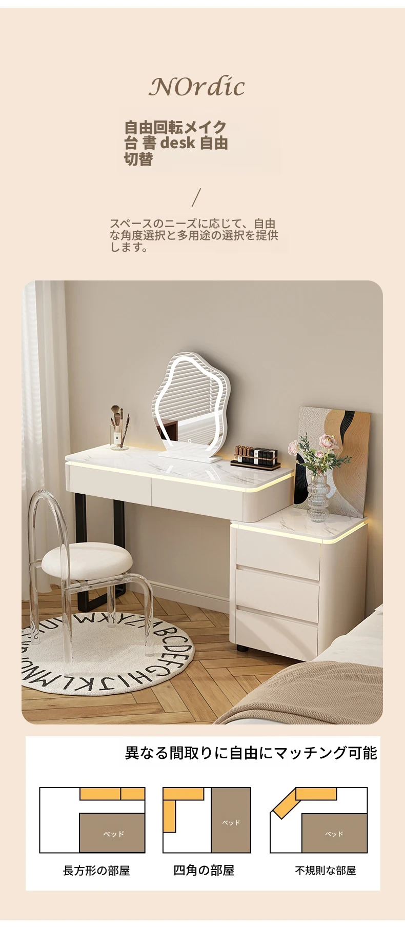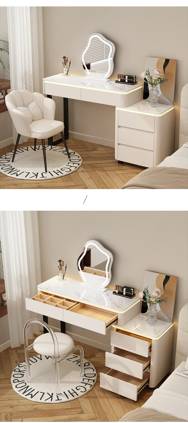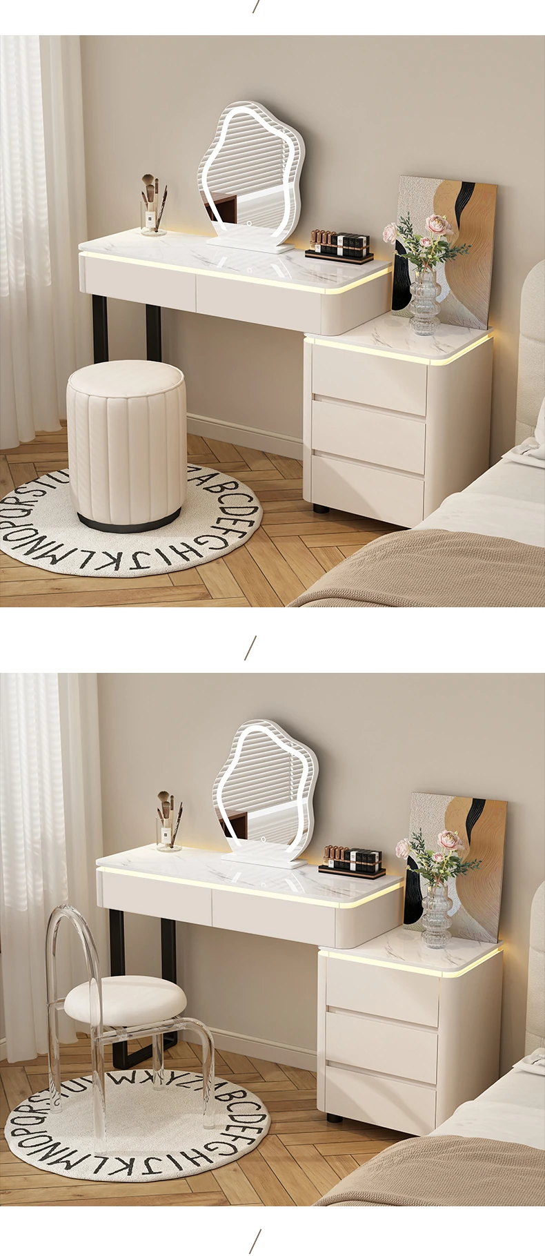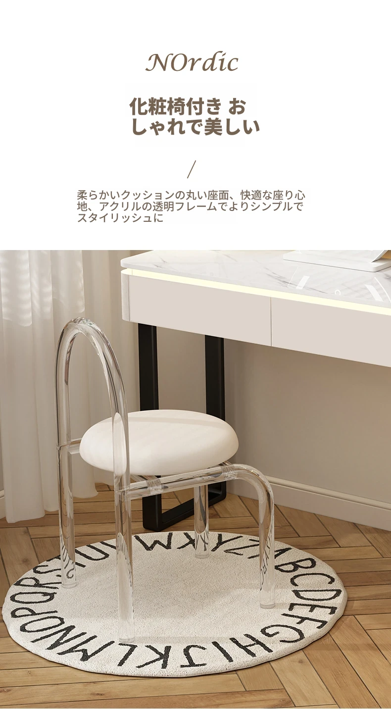 80ホワイトテーブル+3段引き出しキャビネットホワイト+雲の鏡+アクリル椅子ホワイト JX-ムードライトタイプ