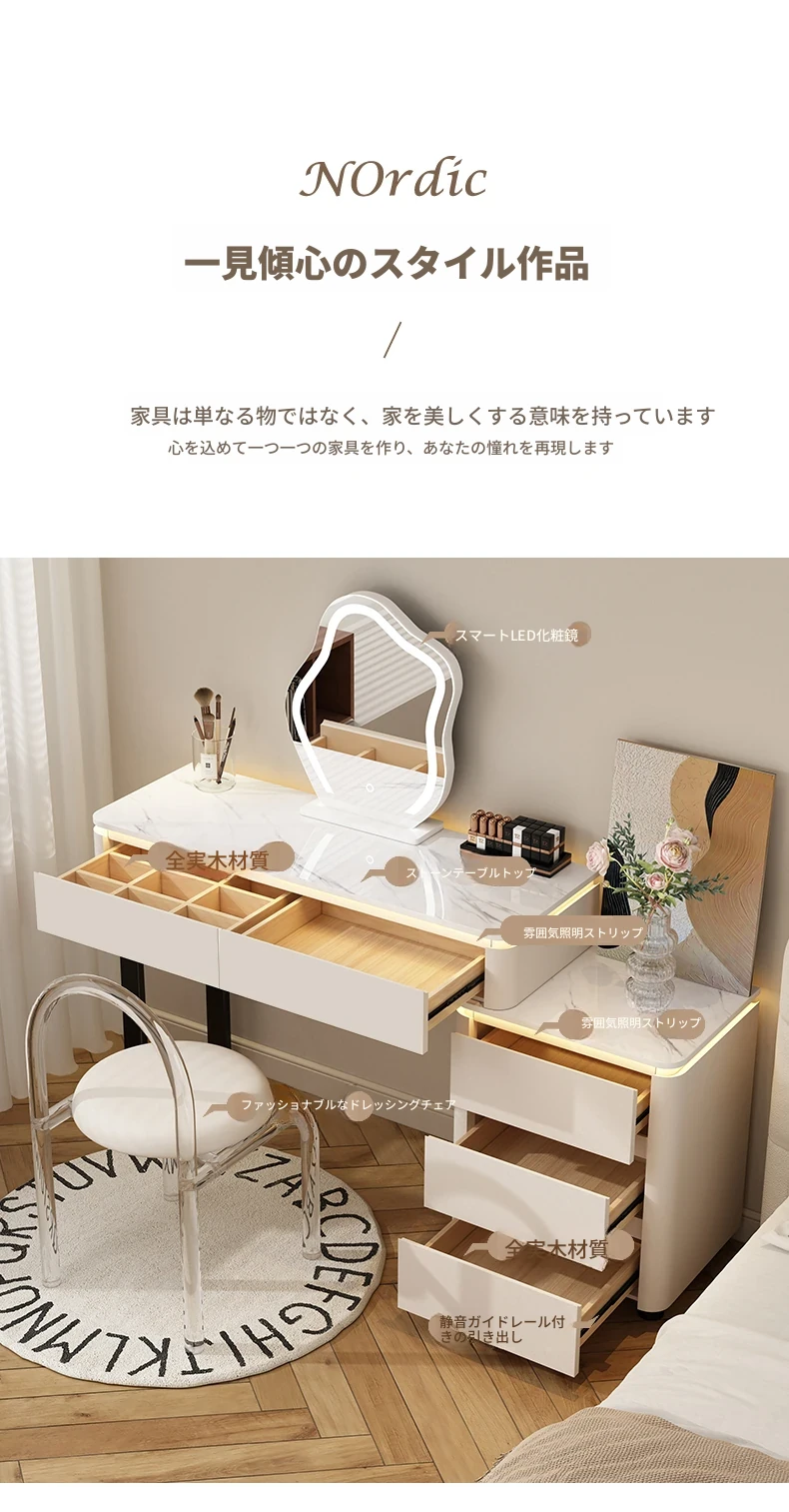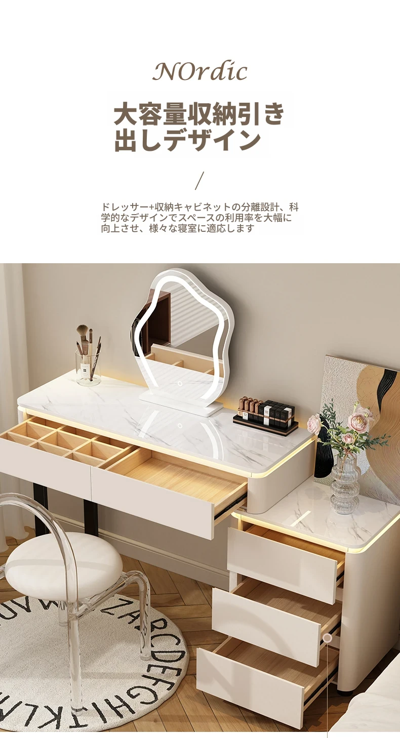 120ホワイトテーブル+3段引き出しキャビネットホワイト+雲の鏡+アクリル椅子ホワイト JX-ムードライトタイプ