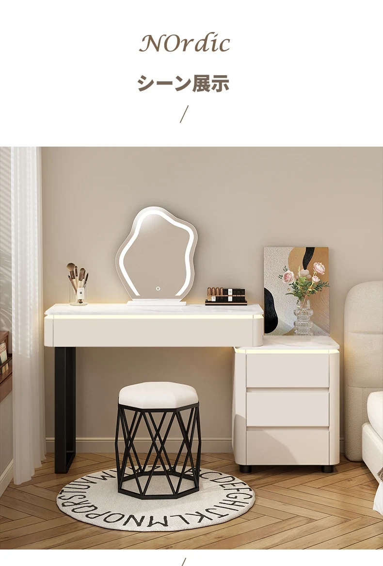 80ホワイトテーブル+3段引き出しキャビネットホワイト+雲の鏡+丸椅子ホワイトブラック JX-ムードライトタイプ