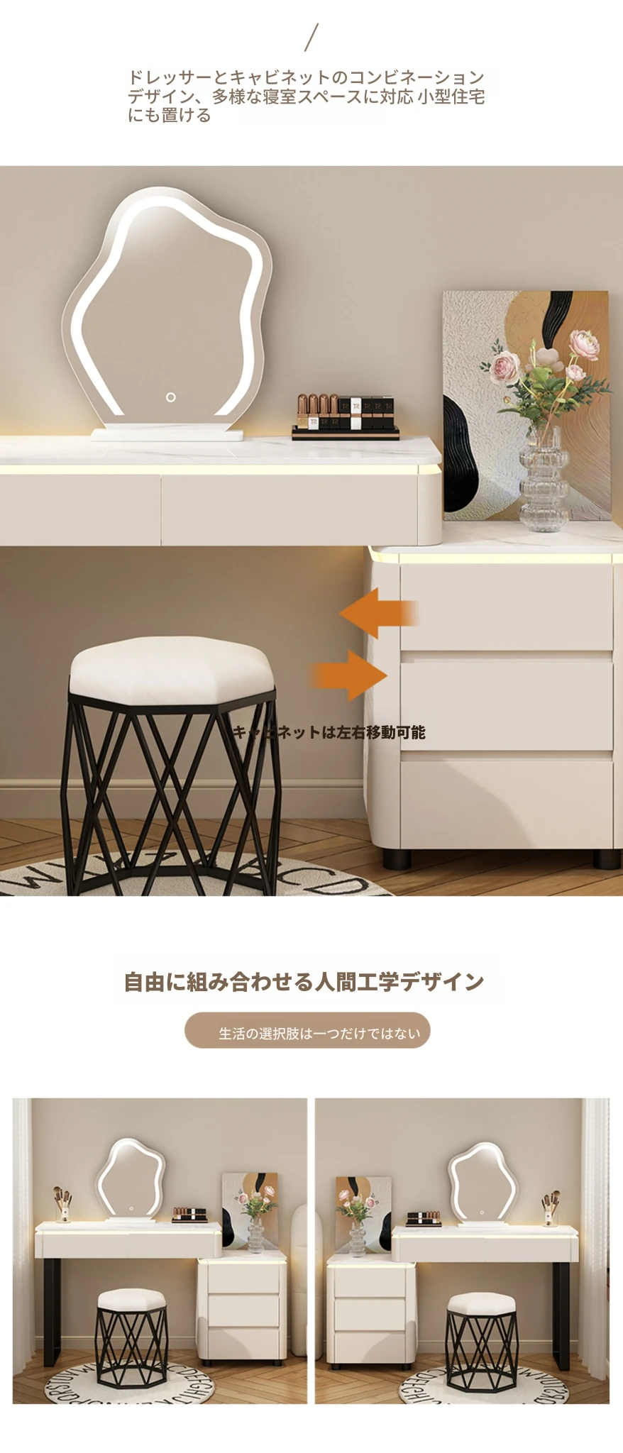120ホワイトテーブル+3段引き出しキャビネットホワイト+雲の鏡:椅子なし JX-ムードライトタイプ